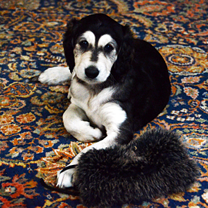 | Die Flat Coated Retriever Hündin Bera, seit 2012 bestens erprobt im Umgang mit stürmischen Saluki-Welpen, ist zu Besuch. Die Welpen, aber auch Kokko, nachdem sie Bera wiedererkannt hatte, sind begeistert von ihr. Im Hintergrund sind auf dem Öl-Gemälde von Manfred Freisleben links der Vater der Welpen CH Lykaon Sawahin, geb. 1988, und dessen Mutter CH Zahra du Zada of Conamor,